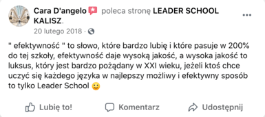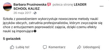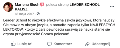 Skorzystaj ze sprawdzonych zajęć, które przetestowały tysiące naszych klientów - oni nie mogli się mylić! Już dziś skontaktuj się z nami i rozpocznij swoją przygodę z językiem obcym. Pomożemy Ci w 100% formalności. Leader School w Kaliszu, to nowoczesna placówka oferująca skuteczną naukę języka obcego.
